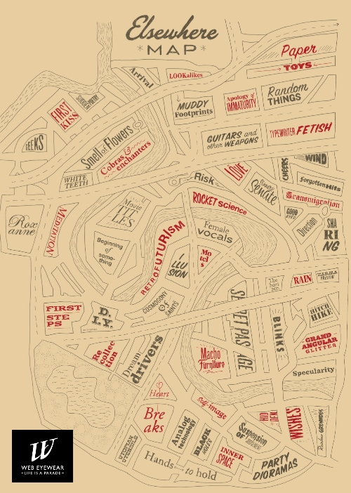 L’esplorazione e la scoperta, concetti cardini della campagna, richiedono la perduta capacità di smarrirsi volontariamente. Per questo Web Eyewear ha realizzato anche la Elsewhere Map, una mappa che invece di indicare vie e piazze indica emozioni, situazioni, oggetti e personaggi.