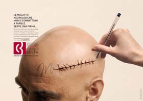 Per far emergere questa specificità, Wrong Advertising ha puntato su un’immagine simbolica dal forte impatto visivo. L’annuncio mostra un cranio rasato attraversato da una lunga cicatrice, il cui filo di sutura è formato da una firma: si tratta, ovviamente, della firma sulla dichiarazione dei redditi per destinare al Besta il 5 x 1000. Il titolo recita: “Le malattie neurologiche non si combattono a parole. Serve una firma”.
