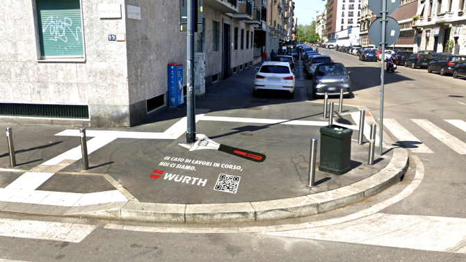 Le installazioni pubblicitarie di Würth sono infatti pensate per comunicare con i cittadini tramite un approccio ecologico. Questi messaggi temporanei, applicati attraverso stencil, sono installati utilizzando una sofisticata pittura alimentare, completamente sostenibile e rimovibile con semplice acqua calda. I graffiti sono inoltre ricoperti da uno strato di Pureti®, una soluzione composta da nanoparticelle che, grazie all’energia solare, innesca un processo chimico capace di rendere ogni graffito un presidio mangia-smog, in grado di produrre ossigeno e al contempo ridurre le polveri sottili presenti nell’aria.