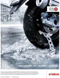 Yamaha presenta la nuova campagna winter pitstop per il check-up invernale dei propri scooter che verrà pianificata su stampa quotidiana e di settore.La creatività, firmata da 1861united, nasce dalla consapevolezza che l’inverno è un grosso ostacolo per chi viaggia su due ruote, e che la cattiva stagione può mettere a dura prova anche i migliori scooter. Ecco perché il ghiaccio, simbolo dell’inverno, si trasforma in una catena che sbarra la strada ad uno Yamaha X-Max. Il concetto è veicolato dalla head: 'Non lasciare che l’inverno ti blocchi'.