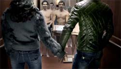 Ed ecco le porte dell’ascensore che si aprono davanti ad un ironico drappello di impiegati intenti nella cura dei loro affari d'ufficio, immortalati nella loro nudità, bizzarra rappresentazione di luoghi comuni, mentre i due protagonisti appaiono vestiti con abiti Datch che esprimono, in questo modo, l'esatto contrario della mediocrità. Vestiti in un mondo di nudi, vestiti della propria capacità di essere se stessi, spogliati dalle inibizioni, dai clichè e dalla banalità.