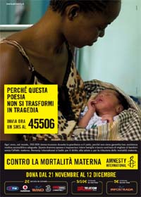 Dal 21 novembre al 12 dicembre 2010 è possibile sostenere la campagna di Amnesty International 'contro la mortalità materna' attraverso il numero 45506 inviando un sms del valore di 2 euro da cellulare privato Tim, Vodafone, Wind, 3 e CoopVoce o chiamando lo stesso numero da rete fissa e donare così 5 o 10 euro da Telecom Italia oppure 5 euro da Infostrada.