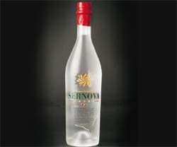 La bottiglia richiama la tipica Bordolese sinonimo di Mediterraneità e il suo vetro satinato affida la purezza del prodotto alle trasparenze del rosone centrale e dell’aquila al piede, suggello e firma delle Distillerie Branca. Il rosone identifica così la centralità del grano italiano come materia prima che, assieme all’acqua purissima, definisce tutta la qualità del prodotto e la passione dell’azienda nella sua lavorazione. I colori evocano il tricolore nazionale, mentre la chiusura manuale a ceralacca racconta la cura e l’eccellenza di vodka Sernova.