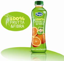Partendo dalla slanciata bottiglia da 750ml in PET - già utilizzata per le referenze Yoga più evolute come AQ e Optimum - è stato ideato uno sleever verde acido particolarmente attuale e impattante: gran parte del facing è dominato dal visual fotografico della frutta, mentre un flash 'ricco in fibre' e una elegante silhouette femminile racchiudono la promessa di sentirsi '100% attivi, leggeri e regolari'.