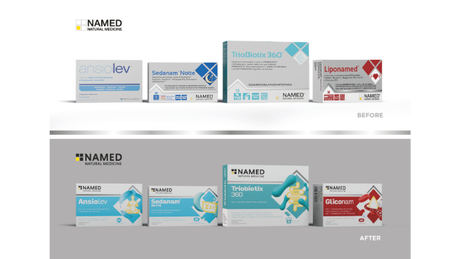 Il nuovo design si fonda su una struttura architettonica chiara, organizzando l'intero portfolio prodotti in 10 aree terapeutiche distinte in base all’area di applicazione o target. Il mother brand Named diventa la base che riunirà tutte le linee di prodotto, creando coesione tra gli articoli e dando riconoscibilità al consumatore.