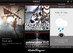 Quattro le sezioni 'editoriali' dell'app visibili e direttamente connesse al canale Vogue.it/trends. Shows, che attraverso esclusive e dettagliate gallery fotografiche e un attenzione ai particolari di ogni collezione, garantisce un accesso ai look di tutte le sfilate della stagione in corso e di quelle precedenti. E ancora Live, la terza sezione dell’applicazione, presenterà gli streaming delle sfilate per vivere l’intensità della passerella. La quarta sezione, Weather, è una curiosa utility concepita per informare sulle condizioni meteo e proporre outfit e accessori adatti al clima del giorno. Non solo del luogo in cui ci si trova, ma anche della città in cui si è diretti: ovunque si sia o si stia andando, si avranno a disposizione tutti i consigli di Vogue Italia per il look più adatto.