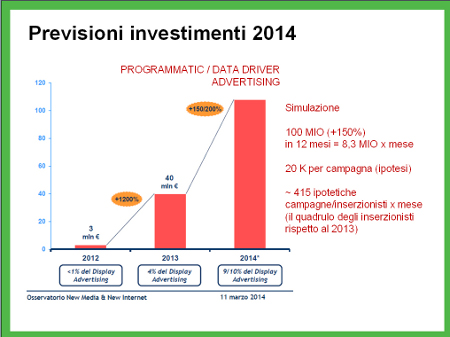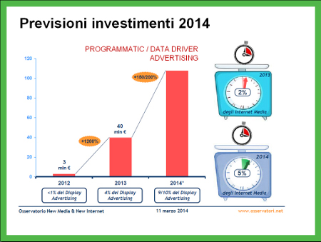 Secondo le stime elaborate da IAB, a novembre 2013 il programmatic/data driven advertising si è attestato su un valore di circa 20 milioni di euro, pari al 4% del display advertising. Una percentuale ancora piccola dunque, rispetto al totale investimenti in adv online (pari a 1,523 miliardi di euro, ndr.), ma destinata quest'anno a salire fino al 9-10%, secondo i dati presentati questa mattina, 2 aprile, da Michele Marzan, vice presidente di IAB Italia, in occasione dall'incontro AdRev Forum, organizzato a Milano da ehi! in partnership con PubMatic.Sarà anche proprio dal sempre maggiore utilizzo di questa nuova forma di advertising che dipenderà gran parte della crescita degli investimenti destinati al web. Se si considera poi che nei mercati già maturi da questo punto di vista, ovvero Regno Unito, Germania e Francia, il programmatic buying rappresenta già il 20% della display advertising, non è difficile ipotizzare anche nel nostro Paese un forte sviluppo di questo mercato. Sviluppo che, come ha messo in luce Marzan, passerà anche dalla nascita di nuove professioni, come il programmatic manager, ad esempio, ruolo simile al technical account manager, che dovrà coniugare una spiccata sensibilità media a un approccio consulenziale.
