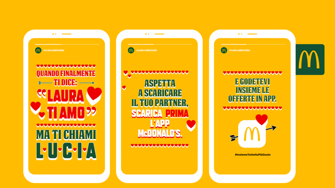 Si tratta di una campagna digital a 360°; l’attivazione media, curata da OMD, vive anche su tutti i canali social del brand – TikTok, Instagram, Facebook - sotto forma di post e stories con copyad ironiche riferite a situazioni in cui prima o poi nella vita di coppia accade a tutti di ritrovarsi. Ma non con l’app McDonald’s, la più scaricata del 2021 nel settore drink&food*, che dà accesso a offerte in grado di far passare in secondo piano ogni scaramuccia d’amore.
