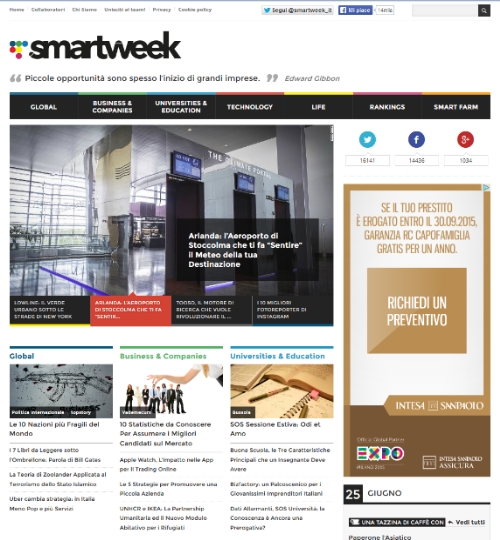 Nato dall’idea di un gruppo di ragazzi motivati nel ritagliarsi un posto nel panorama editoriale italiano, Smartweek si ispira ai modelli internazionali quali Inc.com e Business Insider e punta i riflettori sui temi dell’innovazione tecnologica e del business.