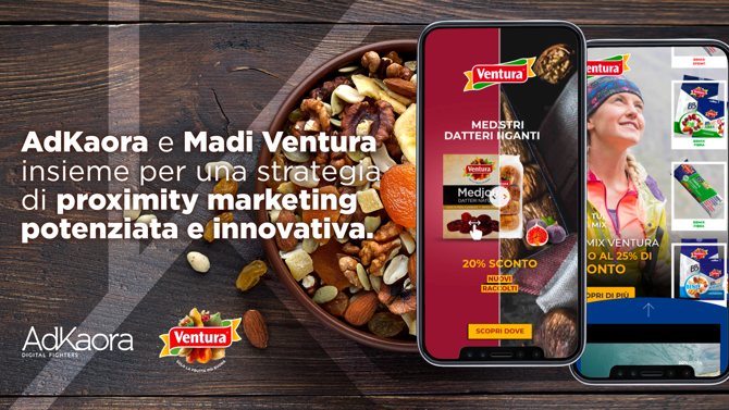 AdKaora, agenzia digitale del Gruppo Mondadori specializzata in mobile advertising user-centric e proximity marketing, continua la sua collaborazione con Madi Ventura, uno dei principali player nel settore della frutta secca, che ha scelto di promuovere tre linee di prodotto stagionali - Fichi e Datteri, Linea Difesa e BBMix Funzionali - con una nuova strategia di proximity marketing.