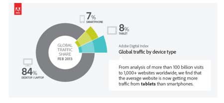 L' 8% della navigazione in rete avviene da tablet, mentre gli smartphone sono a quota 7%: un dato importante, che rende l'idea di quanto sia sempre più importante includere questo mezzo nelle strategie di marketing aziendali. Adobe, da 30 anni attiva nel mercato del digital, ha presentato recentemente al Summit 2013 le novità che riguardano principalmente Adobe Marketing Cloud e Adobe Experience Manager e che consentono anche una gestione ottimizzata dei tablet.
