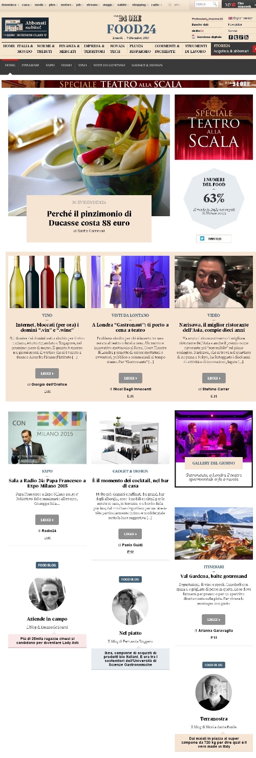 Il blog www.ilsole24ore.com/food24 online sul sito del Sole 24 Ore, nasce per raccontare prodotti, tendenze e personaggi. Focus anche sulla sostenibilità, in vista di Expo 2015. Previsto un ampio utilizzo dei social media.