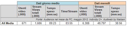 In base ai dati mensili Objects Video di maggio 2012, si registra un’audience di 6,3 milioni di utenti che hanno visualizzato almeno un contenuto video online su uno dei siti degli editori iscritti al nuovo sistema di rilevazione (il 22,5% dell’audience online del mese), con un totale di 49,8 milioni di stream views (video fruiti nel mese) e una media di 30 minuti e 56 secondi di tempo speso per persona nella fruizione di contenuti video online.