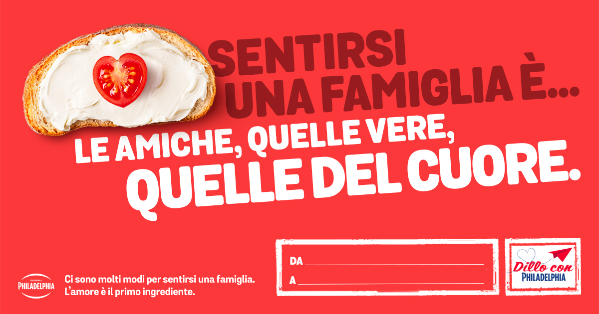 L’attivazione, chiamata “Dillo con Philadelphia”, fa leva sulle emozioni del sentirsi in famiglia, non legandole solamente ai legami di parentela. In questo modo amici, colleghi, i coinquilini o i compagni di squadra possono diventare protagonisti e destinatari di un messaggio che può essere comunicato su diverse piattaforme, offline e online.