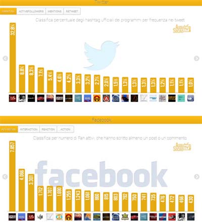 Su Facebook, ‘Servizio Pubblico’ (La 7) conquista il primo posto nella classifica Active Fan con 7.857 fan attivi che hanno prodotto 11.733 post e commenti sulla fan page ufficiale del programma. Al secondo posto troviamo ‘Uomini e Donne’ (Canale 5) con 4.066 fan attivi e 5.300 post e commenti, seguito al terzo posto da ‘X Factor’’ (Sky) con 3.301 fan attivi e 5.178 post e commenti dei fan. Al quarto posto ‘Le Iene’ (Italia 1) con 1.712 fan attivi e 1.856 post e commenti e al quinto ‘Verissimo’ (Canale 5) con 1.707 fan attivi e 2.195 post e commenti.