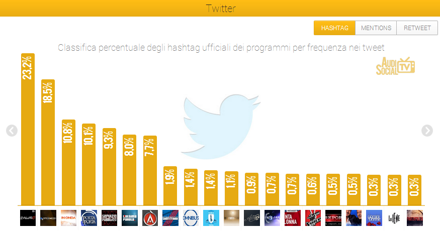 Su Twitter “Ballarò” (Rai 3), si aggiudica il primo posto con il 23,6% dei tweet totali sui programmi monitorati, e “Otto e Mezzo” (La7) è al secondo posto con il 18,5% dei tweet. Al terzo posto “In Onda” (La 7) con il 10,8% dei tweet totali e al quarto “Porta a Porta” (Rai 1) con il 10,01% dei tweet totali. Seguono “Servizio Pubblico” (La 7) con il 9,3% e “L’Ultima Parola” (Rai 2) con l’8,0%.