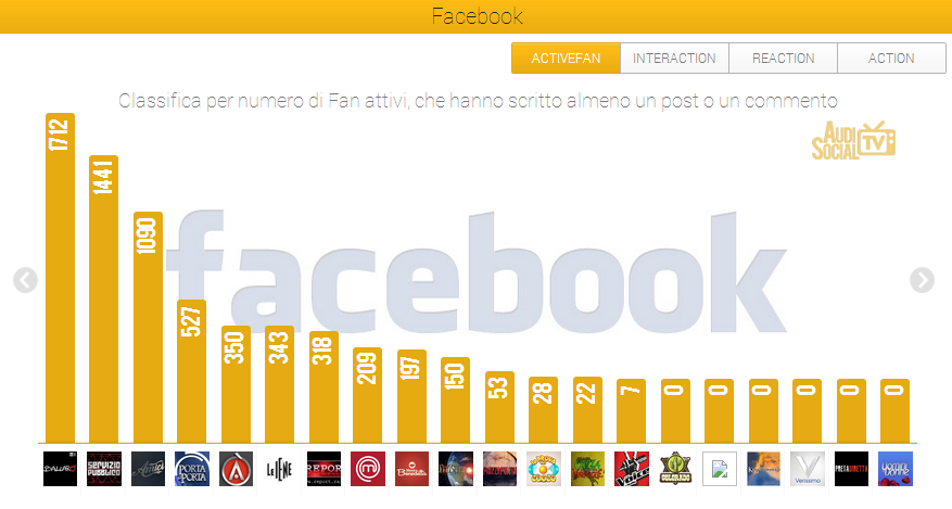 Su Facebook, “Ballarò” (Rai3) è al primo posto nella classifica Active Fan con 1.712 fan attivi che hanno prodotto 2.907 post e commenti sulla fan page ufficiale del programma. Al secondo posto troviamo “Servizio Pubblico” (La 7) con 1.441 fan attivi e 2.018 post e commenti, seguito al terzo posto da “Amici” (Canale 5) con 1.090 fan attivi e 1.553 post e commenti dei fan. Al quarto posto “Porta a Porta” (Rai 1) con 527 fan attivi e 899 post e commenti e al quinto “Agorà ” (Rai3) con 350 fan attivi e 857 commenti.