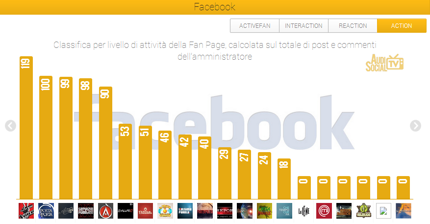 Nella classifica Action, calcolata sul numero di post pubblicati dagli amministratori delle pagine, “The Voice” (Rai 2) questa settimana è il programma più attivo con 110 post della redazione, seguito da “Porta a Porta” (Rai 1) al secondo posto con 100 post, da “Amici di Maria De Filippi” (Canale 5) al terzo con 99 post e “Servizio Pubblico” (La 7) al quarto con 98 post.