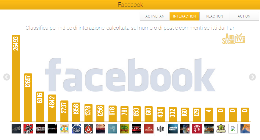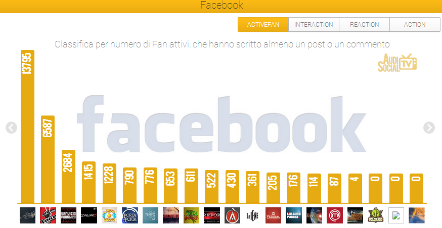 Su Facebook, “Amici di Maria De Fillipi” (Canale 5) è al primo posto nella classifica Active Fan con 13.795 fan attivi che hanno prodotto 26.493 post e commenti sulla fan page ufficiale del programma. Al secondo posto troviamo “The Voice” (Rai 2) con 6.587 fan attivi e 12.697 post e commenti seguito al terzo posto da “Servizio Pubblico” (La 7) con 2.684 fan attivi e 4.842 post commenti dei fan. Al quarto posto segue “Ballarò” (Rai 3) con 1.145 fan attivi e 4.842 commenti e al quinto “La prova del cuoco” (Rai 1) con 1.228 fan attivi e 2.737 commenti.
