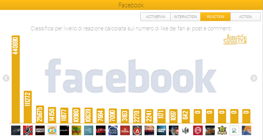 Nella classifica Reaction, che misura il livello di reattività dei fan ai post pubblicati sulla fan page, al primo posto c’è ancora “Amici di Maria De Filippi” (Canale 5) con 440.690 like, davanti a “The Voice” (Rai 2) al secondo posto con 11.272 like e “Servizio Pubblico” (La 7) in terza posizione con 25.675 like. “La prova del cuoco” (Rai 1) è al quarto posto con 1.450 like, davanti a “Ballarò” (Rai 3) al quinto con 1.187 like e “Crozza delle meraviglie” (La 7) al sesto con 10.980 like.