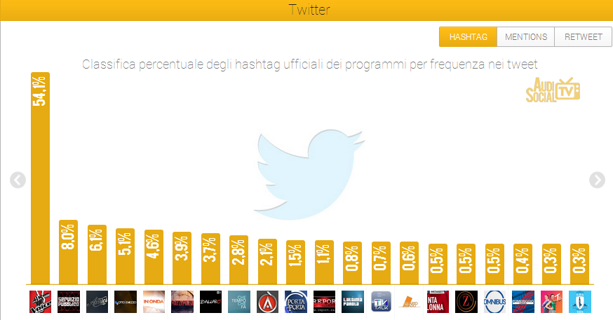 Su Twitter “The Voice” (Rai 2) è il più twittato della settimana con il 54,1% dei tweet totali sui programmi monitorati, seguito da “Servizio Pubblico” (La 7) che registra l’8,0% dei tweet. Al terzo posto “Amici Di Maria De Filippi’” (Canale 5) con il 6,1%, poi “Otto e Mezzo” (La 7) con il 5,1% e “In Onda” (La 7) con il 4,6%.