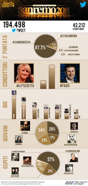 “La seconda puntata della kermesse ha registrato un calo importante su Twitter, ottenendo quasi la metà dei tweet rispetto alla prima. Tra i big, Noemi è stata la più twittata con il 30% dei tweet, seguita da Francesco Renga (20%), Renzo Rubino (15%), Giuliano Palma e Francesco Sarcina (12%), Riccardo Sinigallia (6%) e Ron (5%). E' quanto emerge dall’osservatorio permanente di Reputation Manager che ha monitorato l’andamento degli hashtag su Twitter e dell’interazione sulla Fan Page ufficiale “Festival di Sanremo” su Facebook. Sulla Fan Page ufficiale di Facebook hanno interagito 4.354 utenti attivi che hanno prodotto 9.091 post e commenti totali, e risposto ai post dell’amministratore della pagina con 66.638 like.