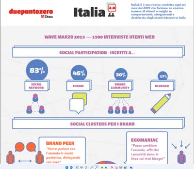 All’interno del workshop 'I nuovi territori di influenza in rete' tenuto da Duepuntozero Research Doxa nella prima giornata di B Com, l’evento b2b dedicato al web-marketing e l’e-commerce promosso da Lingotto Fiere, è stata presentata l’edizione 2013 della ricerca Italia 2.0 che Duepuntozero Doxa conduce dal 2009 sui social media italiani: 1.500 interviste ogni semestre (totale 3.000 all’anno) per dipingere lo stato dell’arte italiano degli utenti internet e le loro attese verso le iniziative social dei brand.