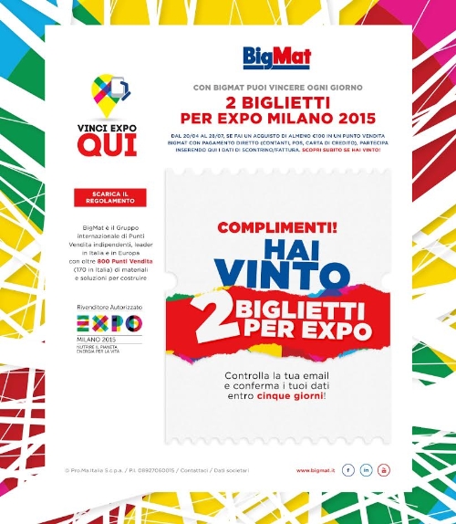 "Vinci Expo Qui " è il concorso di BigMat Italia che, fino al 28 luglio 2015, mette in palio ogni giorno due biglietti d’ingresso a Expo Milano 2015. A supporto una campagna, firmata ItaliaBrandGroup. Si tratta della seconda iniziativa di comunicazione digital che BigMat lancia nel 2015 con l’agenzia guidata dagli imprenditori torinesi Mauro Di Rosa e Franco Di Rosa.