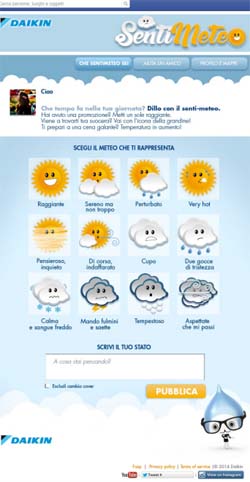Sentimeteo (raggiungibile dalla pagina Facebook di Daikin oppure all’indirizzo www.sentimeteo.social se si è loggati su Facebook) permette agli utenti di personalizzare il proprio profilo in base allo status meteorologico che meglio rappresenta l’umore della giornata. I giocatori possono scoprire attraverso una mappa sociale interattiva qual è il Sentimeteo di tutta Italia e confrontarlo con il meteo reale, divertendosi a cercare le corrispondenze tra clima e sentimenti. E se il meteo degli amici è tempestoso, i giocatori possono inviare un regalo virtuale per risollevare il clima della giornata con un sorriso.