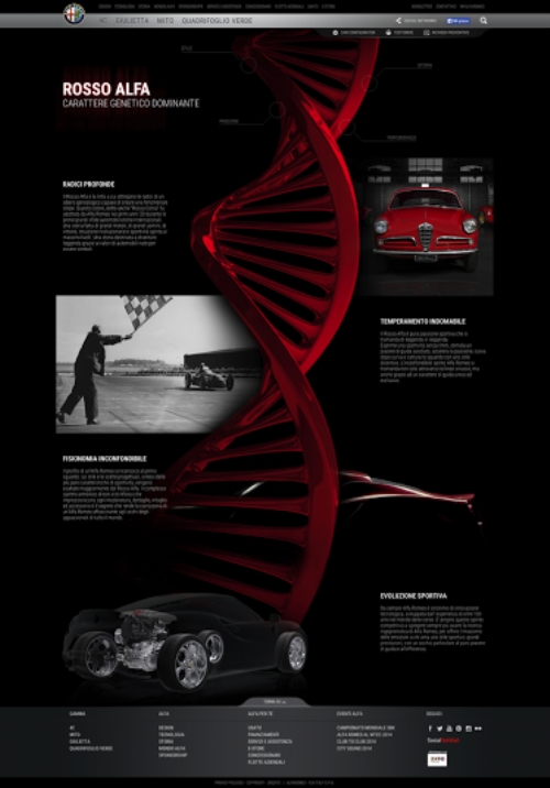 Rosso Alfa diventa la metafora per svelare una natura storicamente adrenalinica e competitiva idealmente rappresentata nella campagna da un filamento di DNA, capace di trasmettere nel tempo caratteristiche uniche, prestazioni e tecnologia ad ogni automobile di questa stirpe. Online sul sito alfaromeo.it una speciale intro page da cui si può accedere al “Manifesto Rosso Alfa”, una nuova sezione dedicata a tutte le sfumature di questo colore e all’identità sportiva del brand. Banner in formato speciale e una campagna multi-soggetto di direct e-mailing coinvolgono gli utenti in una promozione sulla tinta della carrozzeria che sarà inclusa nel prezzo di Giulietta e MiTo.