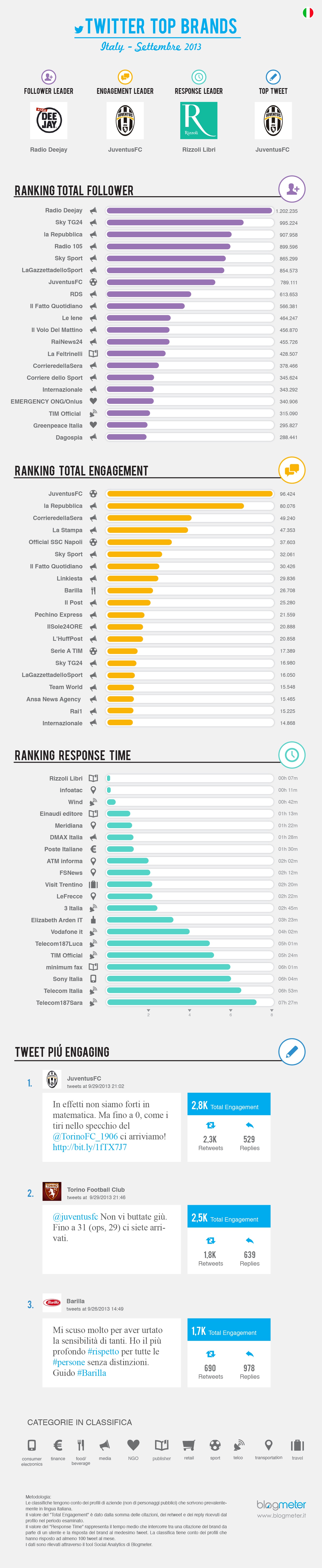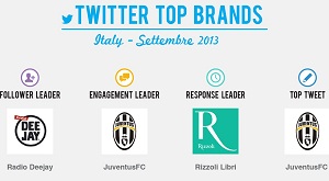 Radio Deejay, brand profile più seguito d'Italia con oltre 1,2 milioni di follower, il profilo più engaging in termini di citazioni spontanee, retweet e reply è invece della JuventusFC che supera quota 94mila. Rizzoli Libri è stato il brand più veloce a rispondere agli utenti: ha risposto a 107 citazioni con una media d'attesa di 7 minuti per ognuna.