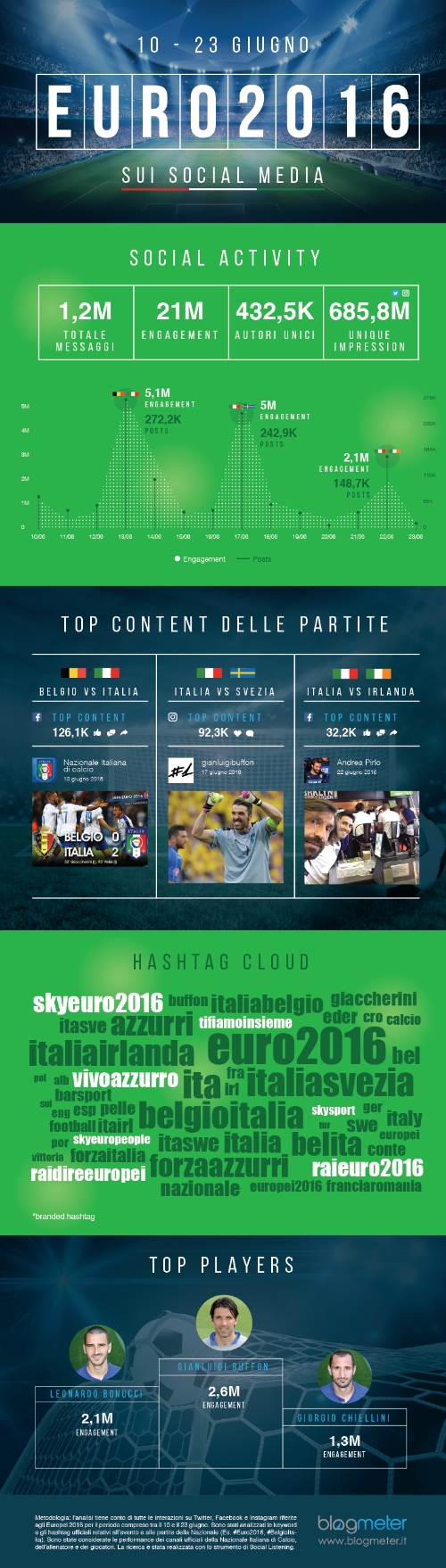 Durante questa prima fase degli Europei di calcio 2016, in cui l'Italia si è aggiudicata un posto negli ottavi di finale, Blogmeter ha registrato sui social media un passaparola di 1,2 milioni di messaggi in lingua italiana - la maggior parte dei quali provenienti da Twitter (64,5%) e pubblicati da ben 432 mila utenti - pari a oltre 21 milioni di interazioni. Tra gli autori più coinvolgenti troviamo in pole position la pagina Facebook della Nazionale Italiana di Calcio che è risultata particolarmente attiva durante la prima partita e generando un totale di oltre 6,5 milioni di interazioni.
