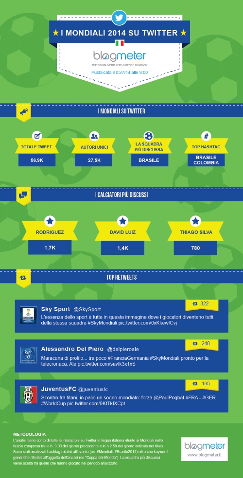 Nell'analisi svolta da Blogmeter, il Brasile è stata la squadra più discussa della giornata di venerdì. Proprio l'hashtag #brasilecolombia è stato quello più utilizzato con 13.600 occorrenze. La Top 3 dei calciatori più citati vede al primo posto il talento colombiano James Rodriguez, tra i migliori della sua squadra, autore di un calcio di rigore che lo ha portato a quota sei nella classifica marcatori. Seguito dalla coppia di difensori verdeoro David Luiz e Thiago Silva, futuri compagni di squadra al Paris Saint Germain. David Luiz, autore di un gol fantastico gol su punizione e Rodriguez sono stati protagonisti anche del post partita, quando il primo ha consolato il secondo, in lacrime dopo la sconfitta e l'uscita dal mondiale. Su questo siparietto, il tweet più engaging della giornata è stato quello di Sky Sport che mostra la foto dell'episodio di grande fair play.