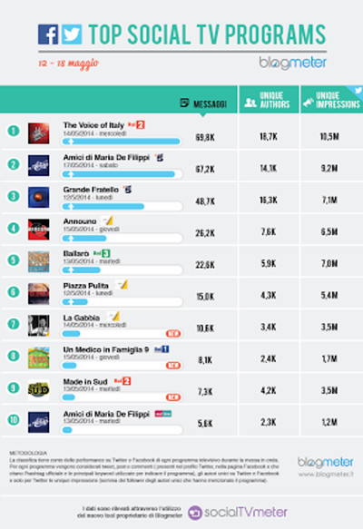 Terminata la parentesi dell' Eurovision Song Contest 2014 che la scorsa volta ha quasi monopolizzato il rating, questa settimana (12/18 maggio) tornano in auge i talent musicali. Infatti la classifica Top Social TV Programs firmata da Blogmeter si caratterizza per il testa a testa tra il talent di RaiDue, "The Voice of Italy" e quello di Canale5, "Amici di Maria De Filippi". Prevale, anche se di poco, il programma condotto da Federico Russo con i coach Raffaella Carrà, Piero Pelù, Noemi e J Ax, che ha generato 69.800 messaggi (tweet + post), con 18.700 autori unici (sia di Facebook che di Twitter), pari a 10,5 milioni di unique impressions (solo di Twitter). Dal canto suo "Amici" segue veramente a ruota con 67.200 messaggi, realizzati da 14.100 autori unici, pari a 9,2 milioni di unique impressions. Si deve invece accontentare della terza posizione il reality, trasmesso sempre da Canale5, il "Grande Fratello", che porta a casa 40.700 messaggi, generati da 16.300 autori unici per 7,1 milioni di u.i..