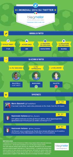 Per quanto riguarda gli azzurri il tweet più popolare, ritwittato più di 130.000 volte, è quello di Mario Balotelli che sarcasticamente annuncia di volere un bacio sulla guancia dalla Regina di Inghilterra, in caso di vittoria dell'Italia contro Costa Rica. Gli altri due tweet più coinvolgenti sono del profilo della nazionale italiana che documenta la visita in ritiro di Emma Marrone e la successiva partenza per Recife, sede del match di oggi.