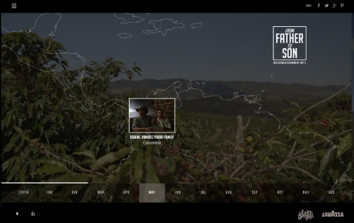 Prosegue la collaborazione tra il brand del caffè e l’agenzia di Zodiak Active (ora parte di Triboo) che per il terzo anno consecutivo racconta sul web le storie e i personaggi dietro i 13 scatti di Joey L.per l’iconico calendario realizzato con la partnership di Slow Food e la creatività di Armando Testa che, quest'anno, avrà come sfondo il Sud America. La relativa pagina web creata ad hoc, offre un punto di vista a 360° sul progetto e i suoi protagonisti, grazie a un viaggio multimediale che ripercorre i luoghi visitati durante le riprese e permette di incontrare i soggetti delle foto, la nuova e la vecchia generazione di contadini a confronto.