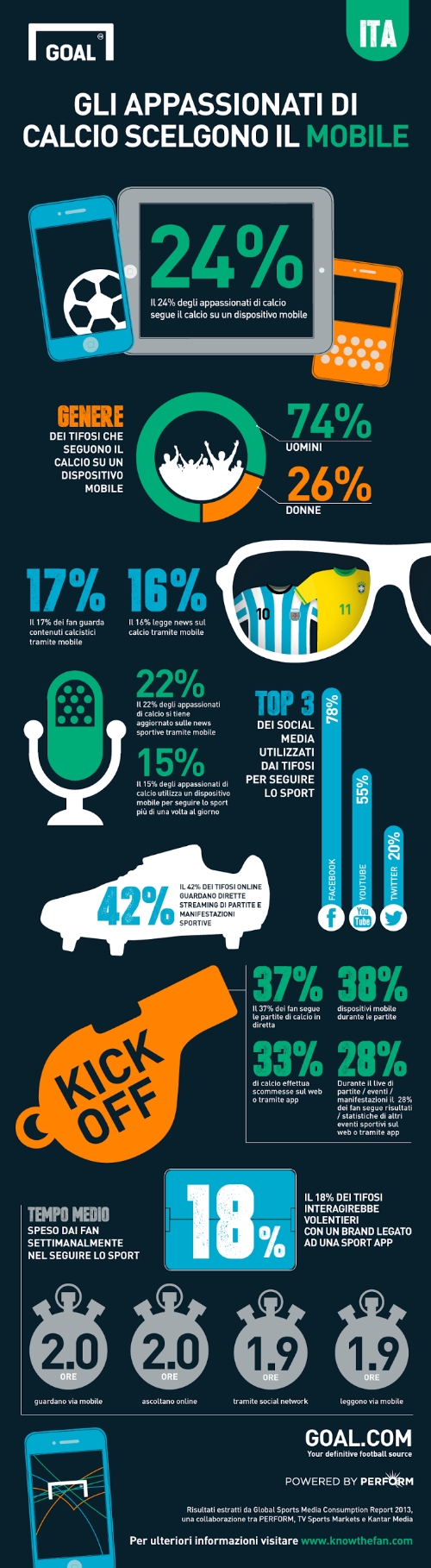 Condotta da Perform Group, leader mondiale nella produzione e distribuzione di contenuti sportivi digitali, in collaborazione con Kantar Media Sport e TV Sport Markets, la ricerca Global Sports Media Consumption Report infatti conferma che i nostri connazionali seguono sempre più spesso lo sport, e in particolare il calcio, attraverso le piattaforme digitali.