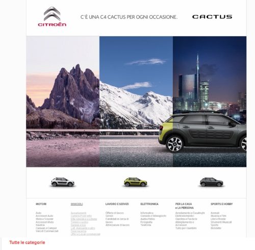 La campagna di Citroën C4 Cactus si articola con overlayer e skin per desktop e box e sponsored ad per desktop e mobile. Con oltre 8,3 milioni di annunci e oltre 3 milioni di visitatori al mese nella categoria Motori, la piattaforma è in grado di garantire un audience verticalizzato e dall’elevata intention to buy.