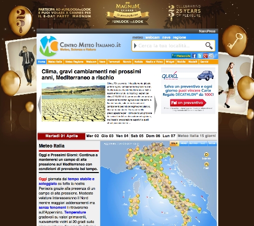 Iniziativa editoriale innovativa in Italia, già partner di riferimento per istituzioni e aziende nazionali come Autostrade per l’Italia, Autogrill, Enel e quotidiani come Il Tempo, Il quotidiano di Calabria, Il quotidiano della Basilicata, Il Giornale di Sicilia, Centrometeoitaliano.it unisce in un webmagazine un’offerta dettagliata di studi climatici, modellistica meteo, previsioni meteo professionali di dettaglio con le ultime news/curiosità su scienza e natura, astronomia, tecnologia e studi climatologici.
