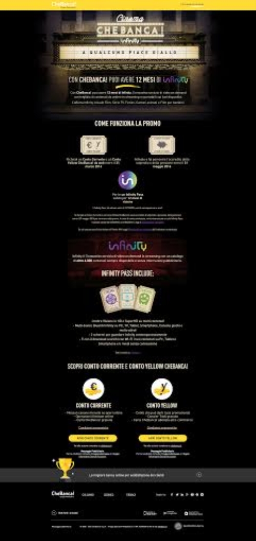 Per tutti coloro che, tra il 1 febbraio e il 31 marzo apriranno un Conto Corrente - il conto a zero spese se operi online - o un Conto Yellow - il conto che offre interessi trimestrali e l’accesso al dossier titoli - o accrediteranno sul proprio conto CheBanca! lo stipendio o la pensione, CheBanca! riconoscerà un Infinity Pass valido per 12 mesi di visione.