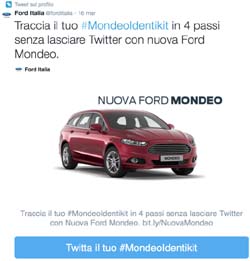 L'agenzia del gruppo WPP dedicata alla comunicazione del cliente Ford Italia, in collaborazione con Twitter Italia ha portato per la prima volta in Europa un nuovo formato: con un semplice tweet, in alcuni step di avanzamento per scegliere colore, motorizzazione e allestimento, è possibile configurare la propria Nuova Ford Mondeo. #MondeoIdentikit è l’hashtag ufficiale dell’operazione. Completata la configurazione, che in Europa nessuna casa automobilistica ha mai usato, l’utente può ritwittare la sua Ford Mondeo, condividendo il risultato ai propri follower.