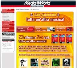 Si chiama Tutta un’altra musica ed è la nuova operazione di Media World per San Valentino, live dal 12 al 14 febbraio su www.mediaworld.it , grazie alla quale sarà possibile scaricare 50 album al costo di soli 5 euro l’uno. Sviluppata tra punto vendita e Internet, la promozione nasce dalla strategia multicanale di Mediamarket e si pone l’obiettivo di integrare sempre di più le attività online e offline. La meccanica della promozione, infatti, prevede l’acquisto di buoni Net-Music in punto vendita, spendibili online per il download di album e brani musicali. L’integrazione tra punto vendita reale e online è alla base della strategia multicanale sviluppata dalla catena, che vede nel consolidamento della relazione con il consumatore una modalità concreta per incrementare la fidelizzazione verso il brand.
