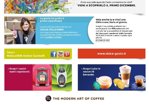 Fan sfegatati del cappuccino, amanti del sound design, artisti in erba, seguaci delle forme d’arte iper moderne. Tutti gli utenti della rete, fino al 5 dicembre potranno votare, col proprio cellulare, l’opera preferita della digital exhibition #35Modernart promossa da Nescafé Dolce Gusto e NABA. Una gallery fotografica accessibile a tutti per scegliere la migliore tra le opere d’arte realizzate dai giovani talenti di NABA, tutte ispirate al caffè e alle bevande Nescafé Dolce Gusto.