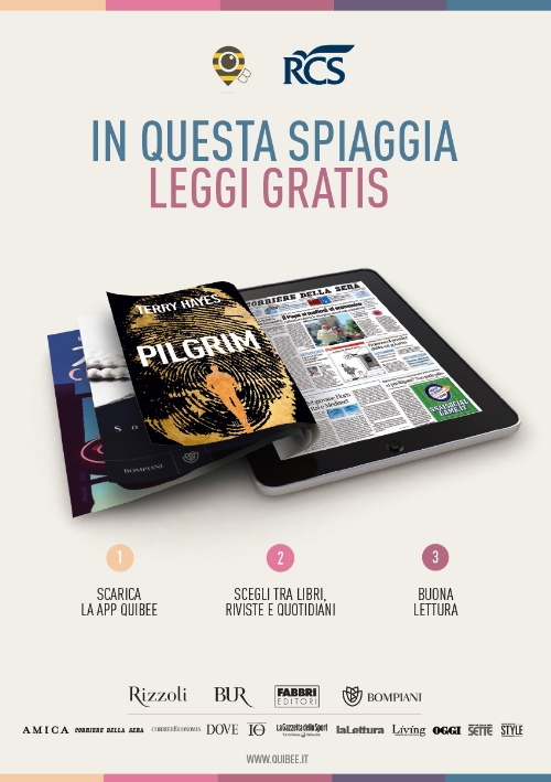 RCS innova il modo di fruire dei contenuti editoriali e, grazie alla collaborazione con QUIBEE, presenta la prima libreria digitale consultabile gratuitamente e in modo integrale direttamente dalla spiaggia. L’iniziativa parte con un network sperimentale di 10 stabilimenti balneari in cui gli ospiti, a partire dal 1° agosto fino alla fine di settembre, avranno accesso ai più apprezzati best-seller dell’estate di RCS Libri, oltre che a Corriere della Sera, La Gazzetta dello Sport e a tutti i periodici del Gruppo RCS.