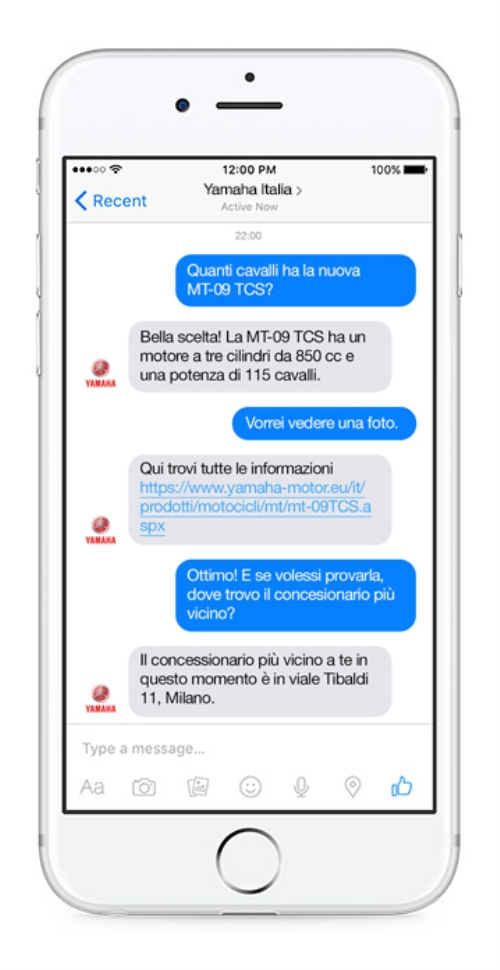 Dubbi e curiosità dei bikers appassionati del brand Yamaha saranno soddisfatti istantaneamente grazie al Facebook Messenger Bot, attualmente in fase di sviluppo da parte di Connexia per la filiale italiana della celebre casa motociclistica nipponica.