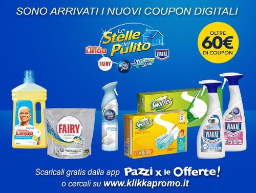 L’iniziativa coinvolge le 5 marche per la Pulizia della Casa di P&G - Ambi Pur, Fairy, Mastro Lindo, Swiffer e Viakal -. Scaricando l’applicazione mobile Pazzi per le Offerte, o accedendo al sito www.klikkapromo.it, è possibile scaricare oltre 60 euro di coupon digitali, che saranno convertiti in crediti spendibili sui circuiti di spesa proposti dalla piattaforma, a fronte dell’acquisto del prodotto e del caricamento della prova d’acquisto.