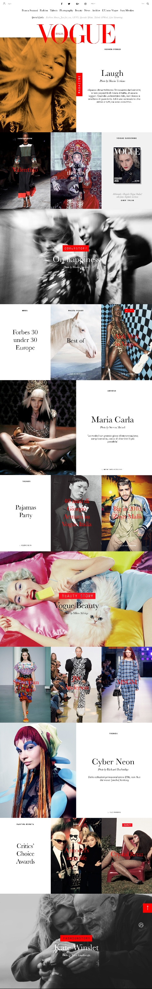 Come anticipato qualche settimana fa in occasione dell'incontro volto a presentare tutte le novità 2016 di Condé Nast (leggi news), debutta oggi, 22 febbraio, il nuovo sito di Vogue Italia. Nato nel 2010, Vogue.it, che conta oggi 2.8 milioni di utenti e 46 milioni di pagine viste e, su Facebook supera i 2 milioni di fan, si rinnova completamente. Il segno distintivo, che vuole diventare un nuovo standard di interazione è il frame, una cornice rossa che mette in evidenza il contenuto del sito e ne facilita la lettura.