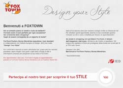 FoxTown Factory Stores di Mendrisio, l'outlet che vanta oltre 250 brands in 160 negozi, in collaborazione con IED Centro Ricerche, lancia oggi Design Your Style, una guida online interattiva e personalizzata per lo shopping.Si tratta di un inedito sito internet - www.foxtown-designyourstyle.ch - grazie al quale le clienti, rispondendo a un questionario online, potranno interrogarsi sui propri gusti in fatto di stile, accogliere suggerimenti pratici per migliorare il proprio look, ricevere consigli utili sulle riviste da leggere, i blog da esplorare o i siti internet da visitare per migliorare il proprio aspetto, valorizzando le proprie caratteristiche.