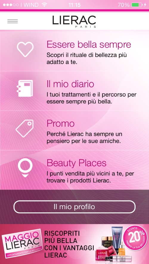 Scoprire le promozioni nella farmacia più vicina, annotare i promemoria nel diario ed essere aggiornate sugli ultimi trattamenti cosmetici direttamente sul proprio smartphone. Da oggi è possibile grazie all’app che è stata realizzata per Lierac, il noto brand di bellezza di Alès Groupe, da DGT Media, l’agenzia digitale del gruppo Italia Brand Group. Facile da navigare e soprattutto sempre a portata di touch, è disponibile per iPhone e Android. Il concept attorno al quale è stata sviluppata questa mobile app è quello di fornire alla community di consumatrici attuali e potenziali dei prodotti Lierac uno strumento digitale per ricevere e condividere informazioni personalizzate sui trattamenti.