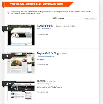 Sul podio della “Top Blog Chart Generale”: Cadoinpiedi, Beppe Grillo’s Blog, Hd Blog. Nella top 20 anche TVBlog, NinjaMarketing e il blog di Gad Lerner.